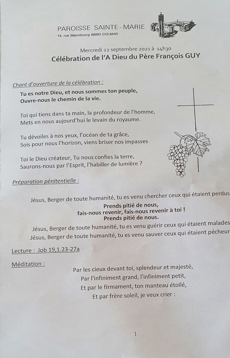 Lors de la cérémonie le vicaire épiscopale d'Alsace centre a lu, à l'assemblé présente, le parcours de vie de père François Guy dont le texte suit :